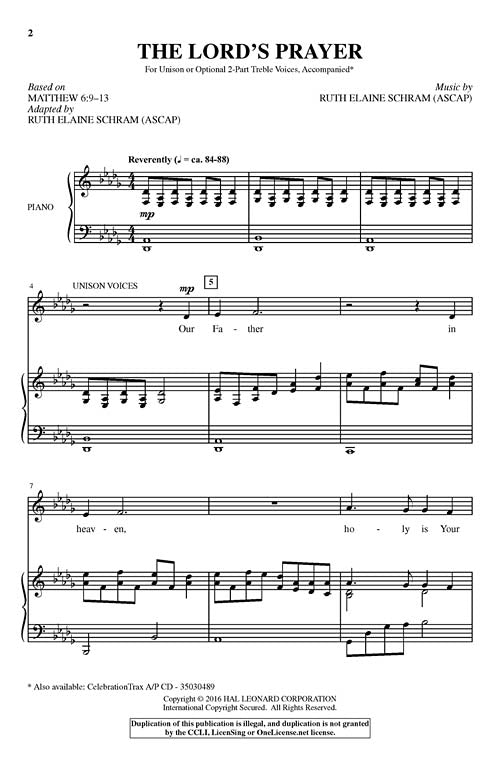 Uses: General, Weddings Scripture: Matthew 6:9-13 This beautiful anthem, with its stirring melody and gentle accompaniment, brings to life the prayer that Christ taught us to pray. The piece is easily accessible for choirs of all ages and promises to enhance any worship experience where the Lord's Prayer may be shared through song. Available separately: Unison/opt. 2-Part Treble, CelebrationTrax CD. Duration: ca. 3:12 href=https://youtu.be/kaJVrh8PnT4 target=_newScorePlay - click to view score with recording./