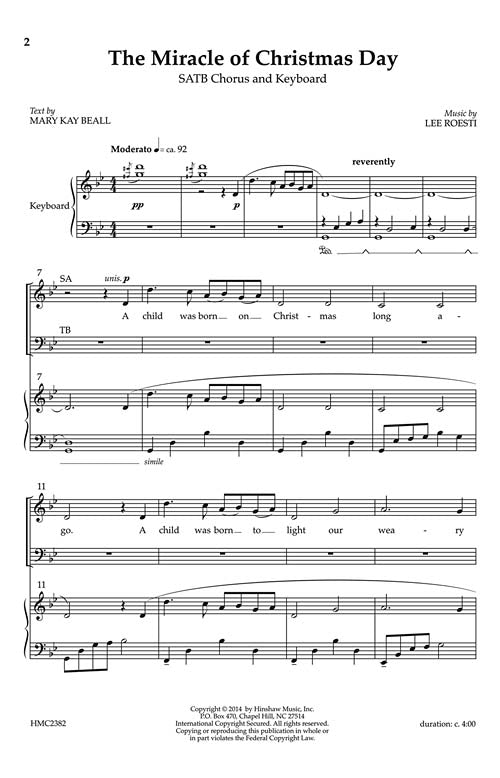 The text for this lovely anthem is by prolific lyricist Mary Kay Beall. Here Lee Roesti sets the gentle text for mixed voices accompanied by piano or organ. Consider using the piece on Christmas Eve, during Christmastide or Epiphany. Difficulty Level: Medium Adult.