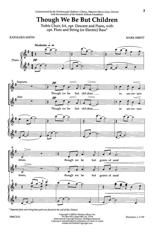 This secular work is scored for treble choir (mostly two-part) and piano with optional flute and bass. A young girl in the commissioning choir wrote the text. Give it a try with your children's organization. Difficulty Level: Medium Advanced Children or Medium Easy Adult.