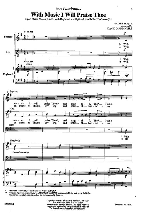 Natalie Sleeth was known for her simple, inventive beauty of melody. Here David Giardiniere arranges her work for SAB choir, keyboard and optional handbells. Excellent for celebrating the power of music. Difficulty Level: Easy Children or Easy Adult.