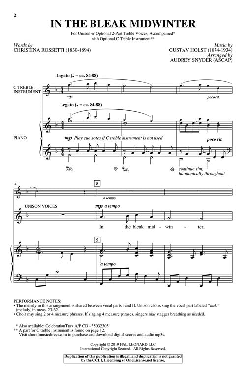 In The Bleak Midwinter Unison 2 Part Treble Gustav Holst