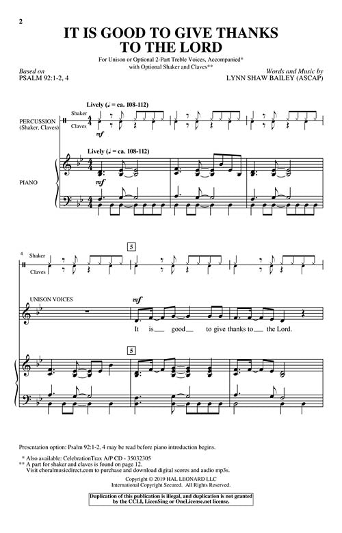 It Is Good To Give Thanks To The Lord Unison 2 Part Treble Lynn S