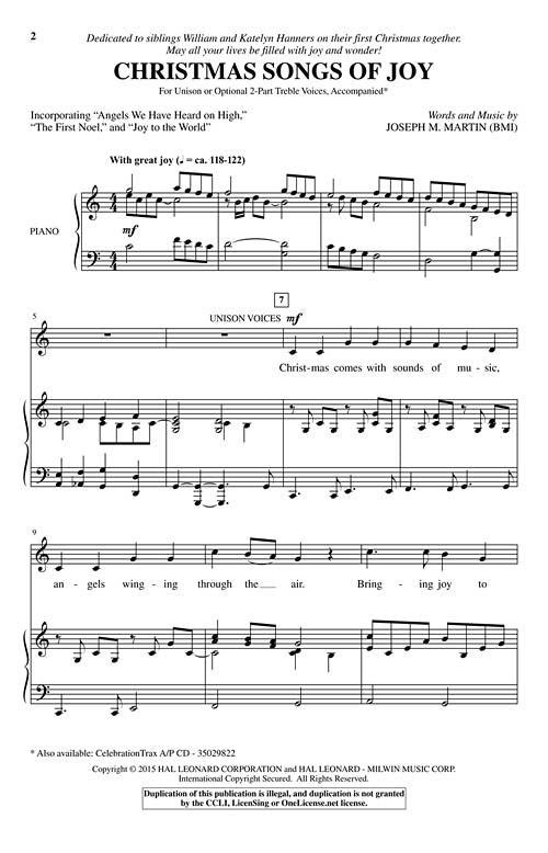 Christmas Songs Of Joy Unison 2 Part Treble Joseph M Martin