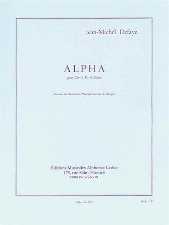 Alpha is a piece for Horn and Piano accompaniment by Jean-Michel Defaye dedicated to Georges Barboteu, a professor at the National Conservatoire. Starting slowly with an exchange between the Horn and the Piano, this piece features a Cadenza section with a Horn solo followed by a Tempo part (112). The final of the piece is to be played Lento (60). This piece has some really strong and expressive moments, quite dramatic from time to time, and was initially written for a Conservatoire contest. It lasts approximately 8 minutes 40. As a pianist, composer, producer and arranger, Jean-Michel Defaye mainly created pieces for brass and wind instruments. He won the Premier Second Grand Prix de Rome in 1958 and the Belgian Queen Elizabeth composition competition in 1959.
