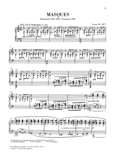 The work was originally intended as part of the Suite bergamasque (HN 381), like L'Isle joyeuse (HN 386). Yet in the end Debussy chose other pieces for the Suite, and published Masques and L'Isle joyeuse separately in September and October 1904 as new compositions. Both pieces were written in summer 1904, a particularly turbulent period in Debussy's life, as he had just left his first wife Lilly for Emma Bardac. The Masques appear to be much more reserved and at the same time more mysterious than the Isle joyeuse. The Catalonian virtuoso Ricardo Viñes gave the premières of both works, which have remained extremely successful to this day.