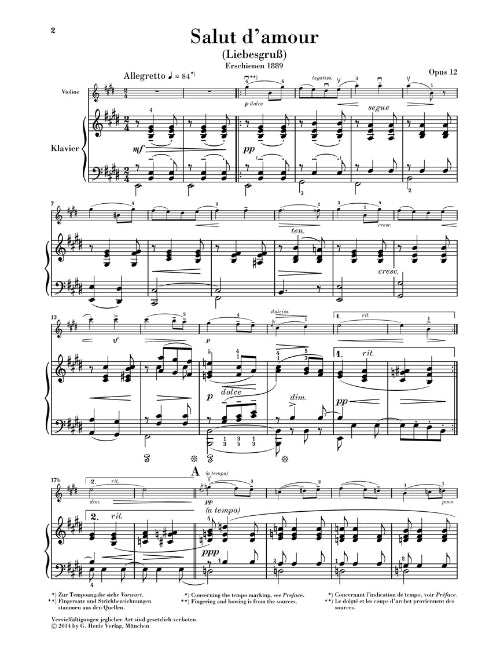 Edward Elgar Salut Damour Op 12 For Violin And Piano With Marked And Unmarked