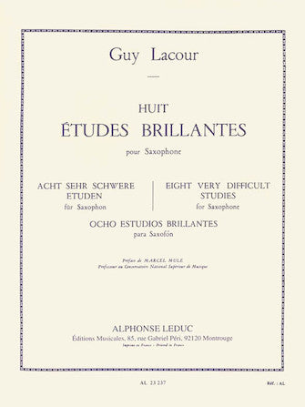 Composed by Guy Lacour, Eight very difficult studies was written for advanced Saxophone players. The book features an introduction by Marcel Mule and is actually dedicated to him. These mechanism exercises are very challenging, but maintain some nice melody and their aim is definitely to help the player to keep their technique and skill growing. Each study has a different tempo, key signature and technical difficulties, in order to improve the technique of any saxophonist and to obtain the best results possible. Guy Lacour (1932-2013) was a French musician, composer and saxophonist. He studied with Marcel Mule and Fernand Oubradous, and composed many pieces for Solo Saxophone, Saxophone and Piano and also Flute and Piano.