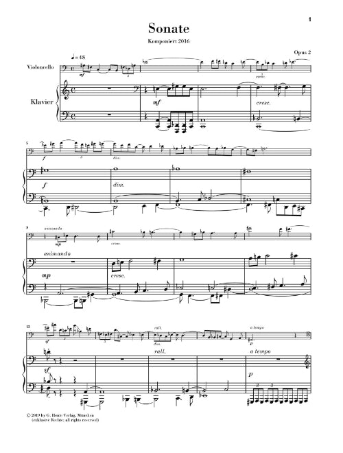 This single-movement sonata for cello and piano, Evgeny Kissin's Opus 2, evokes a sombre, melancholic ballad. The approximately ten-minute work from 2016 places high demands on both instrumentalists in its execution. Having rehearsed the sonata in close consultation with the composer and performed it, Steven Isserlis contributes fingerings and bowings in an additional cello part. A marvelous addition to the cello repertoire!