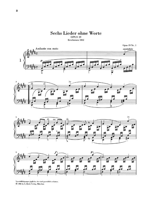 When Mendelssohn learned from his publisher Nikolaus Simrock that he was to receive an additional honorarium for a part of his Lieder ohne Worte, he effusively thanked him for this gift. However, the gift that Mendelssohn, in his turn, made to posterity with these Songs Without Words could probably not have been foreseen even by him at this time. These Original Melodies, Romanzen or Clavierstücke, which only later gained the title Lieder ohne Worte, enjoyed great success during the composer's lifetime, and should be included amongst the most rewarding pieces of 19th-century piano literature. Ourvolume contains the complete Lieder ohne Worte published during his lifetime and posthumously.