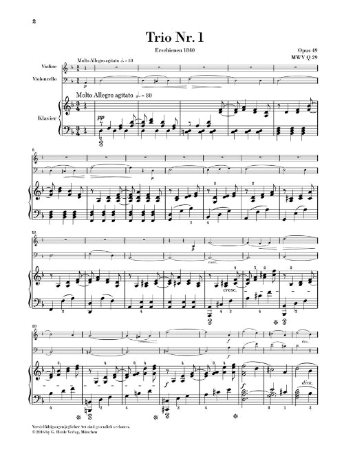 After an early work and a discontinued attempt in 1831/32 Mendelssohn made his breakthrough in this important chamber music genre in the summer of 1839 with the Piano Trio in d minor op. 49, which was to be followed six years later by the Trio in c minor op. 66. On publication of the first trio, Schumann took the opportunity to describe the composer as the Mozart of the 19th century, whereby he was obviously alluding to the mixture of Classical and Romantic stylistic elements. The musical text of these two famous trios has been thoroughly revised to reflect the latest scholarly findings. In addition HN 1297 also includes a flute part for the alternative version of op. 49 (flute instead of violin) that Mendelssohn himself made.