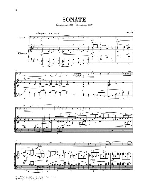 A short while ago Henle issued Mendelssohn's second Violoncello Sonata, op. 58. Now the first Sonata, op. 45, is available for the first time as Urtext edition with a flawless music text. A preface and critical commentary provide detailed information on this major contribution to the romantic violoncello repertoire.