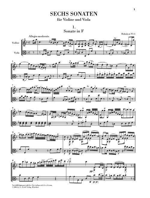 The title Solo per il Violino which Haydn gave these sonatas in his Entwurf-Katalog (the handwritten catalogue he maintained of his own works), already gives us an indication: it is only the violin which is treated as a solo instrument in these six sonatas - the viola has an accompanying role. Haydn might have written these soli for himself; but they also might have been for Luigi Tomasini, the first violinist at Esterházy's court. Today these duos enjoy great popularity, particularly for teaching purposes. We are now proud to present the definitive Henle edition following the text in the Complete Edition of Haydn's Works - with the addition of specially composed cadenzas.
