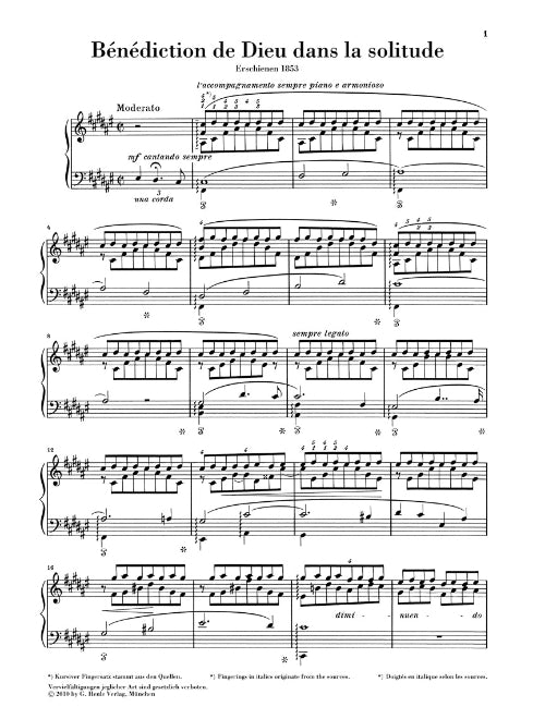 Liszt's piano cycle Harmonies poétiques et religieuses (HN 639) was inspired by religious-philosophical poems of the French Romantic Alphonse de Lamartine. Whereas the cycle as a whole remained comparatively unknown, single works have become an established part of the demanding standard repertoire for pianists. Aside from Funérailles (HN 748), the same is true of the longest work in the volume Bénédiction de Dieu dans la solitude. This work, which is particularly expressive musically, is now appearing for the first time in the Henle catalog as a single volume; it is prefaced by Lamartine's text in three languages. The fingering is by the composer.