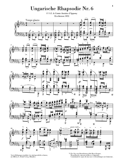 Henle has been producing editions of all of Franz Liszt's Hungarian Rhapsodies, brilliant pianistic excesses and a favorite with all virtuosos. Hungarian folk music was a source of inspiration for Liszt throughout his life. The best known example is the Rhapsodies hongroises for piano, which made the charac-teristic syncopated rhythms of the puszta melodies and the fiery temperament of the czardas famous throughout the world. The popularity of these very demanding showpieces for the piano is shown by the countless arrangements which even include transcriptions for orchestra.