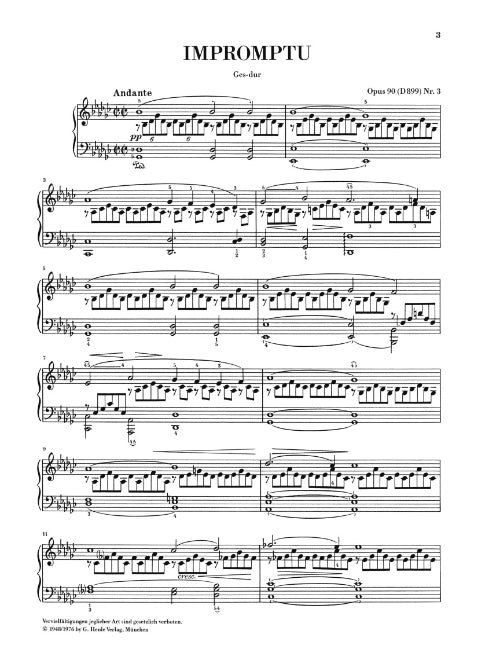 In his collections of impromptus and Moments musicaus, Franz Schubert impressively showed at the end of his life how a lyrical, songlike form can be rendered on the piano. In spite of their simplicity, his popular impromptus op. 90, for example, prove themselves to be consummate works of art, and number among the most beloved pieces of Romantic piano music. The third impromptu of op. 90, an Andante in G flat Major, is a mysterious reverie in pianissimo. A peaceful melody hovers over a murmuring accompaniment of eighth-note triplets, while the harmonies change very gently. This Urtext edition provides the work as a separate edition in the original key. To make it easier to play, other editions often transpose it into G Major, which, however, diminishes the distinctive color of this piece.