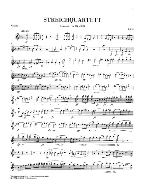 Franz Schubert composed the song Death and the Maiden in 1817, and in 1824 used that melody in the theme-and-variations second movement of his String Quartet in D minor D. 810. The song's popularity in the second half of the 19th century was responsible for the string quartet becoming known by the title Death and the Maiden. Like all of Schubert's mature chamber music works, it captivates with its technical perfection and high intellectual demands. Very prominent here is Schubert's desire to motivically link the movements together. Oddly enough, the work was neither performed nor published during his lifetime; the incomplete autograph score and the posthumous first edition of 1831 have thus served as the sources for our edition.