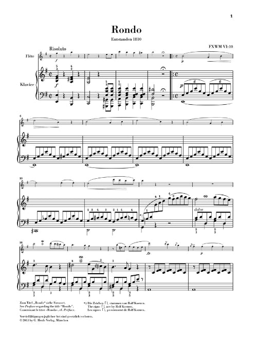 Franz Xaver Wolfgang Mozart did not have an easy time of it - throughout his life his compositions were always compared to those of his father. It is only recently that he has slowly begun to come into his own. His works have their very own individual sound that already forges a link with Romanticism. The specialist Karsten Nottelmann has edited Urtext editions of all of Franz Xaver's piano works for Henle publishers (HN 958, 959), and now he is continuing with the Rondo for flute and piano. Flautists greatly value this melodious work that is very suitable for teaching purposes and music at home.