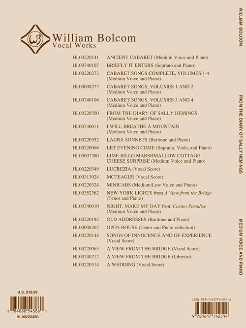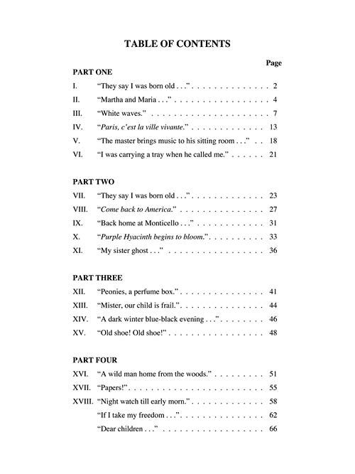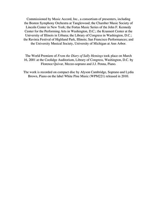 18 songs with texts by Sandra Seaton. The singer performs from the perspective of Sally Hemings, a slave of Thomas Jefferson with whom he had an intimate relationship. Includes vocal texts.