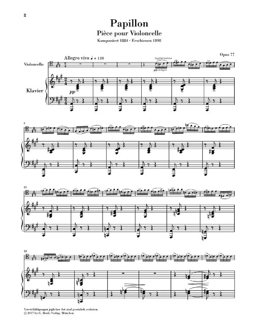 After the great success of his Élégie, Fauré's publisher Hamelle urged him to write another, similarly effective piece for cello and piano. Papillon was probably already composed in 1884, though it was only published in 1898. Whereas Fauré just wanted to call it Piece for Violoncello, his publisher insisted on a more evocative title, and ultimately succeeded in giving it its present name (meaning butterfly). But Fauré is said to have been indignant, remarking: Butterfly or dung fly - use whatever you want. The success of the work proved Hamelle right - Papillon is today just as popular with cellists as the Élegie, and is now available as a Henle Urtext edition.