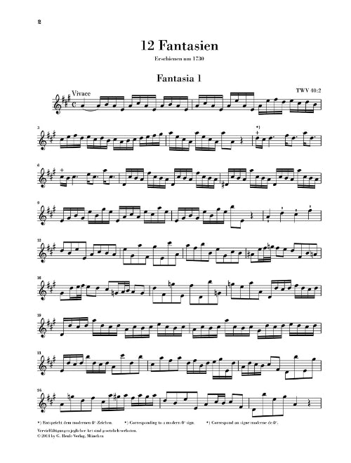 Aside from the Partita in A minor by Johann Sebastian Bach (HN 457) and the Sonata in a minor by his son Carl Philipp Emanuel (HN 555), it was also mainly Telemann's 12 Fantasias that enriched the solo flute repertoire in the first half of the 18th century. Telemann's cycle evidently had a great influence on the flautist's world. The composer had his Fantasias published in 1727 (he might even have engraved the edition himself). The work was soon considered to be exemplary and caught on. This edition is based on Telemann's print, which is also reproduced as a facsimile in the edition. The flute expert Rachel Brown has provided commentary with details regarding performance practice.