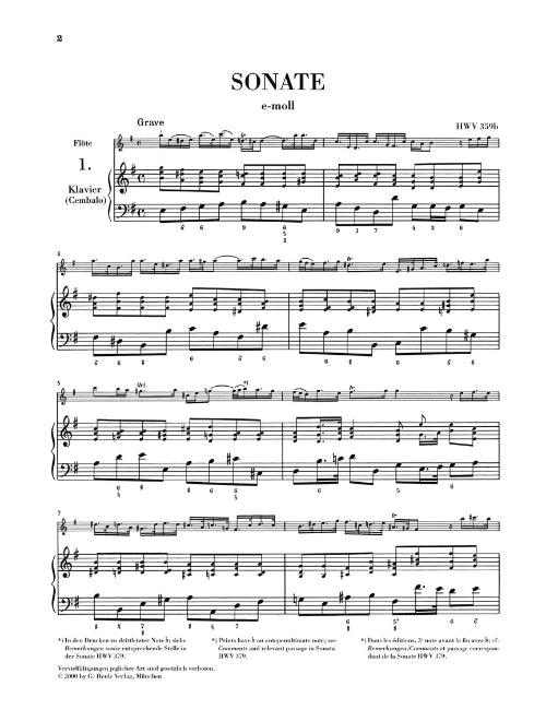 The Urtext instrumental part of this edition is laid out as a combined flute and bass part (featuring the original basso continuo figures without realization). This manner of reproduction is oriented on the historical sources. Thus it is possible for an experienced continuo player to improvise a free accompaniment of his own to the sonata. Two copies of this dual part are included in this Henle edition, so that both players, flautist and accompanist, can perform from this combined musical text. In addition to the basso continuo figures, the score offers a historically appropriate basso continuo realization that can be played at sight. In order to avoid page turns within the movements, the instrumental part is provided with a fold-out panel and a blank page.
