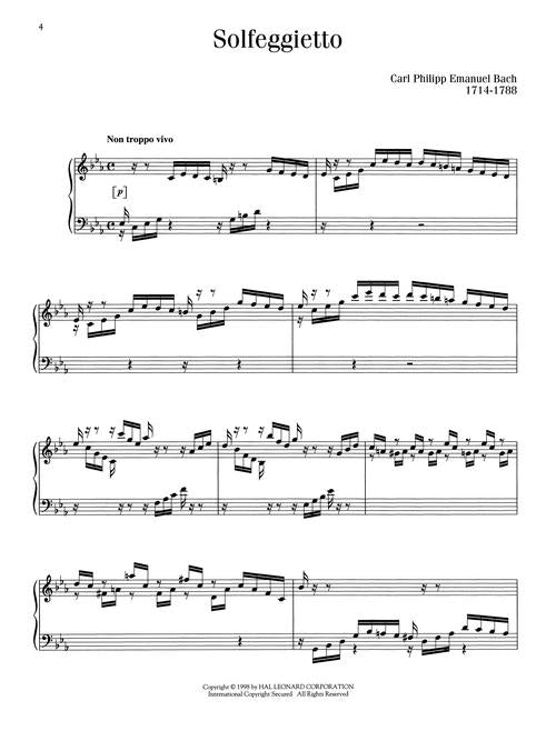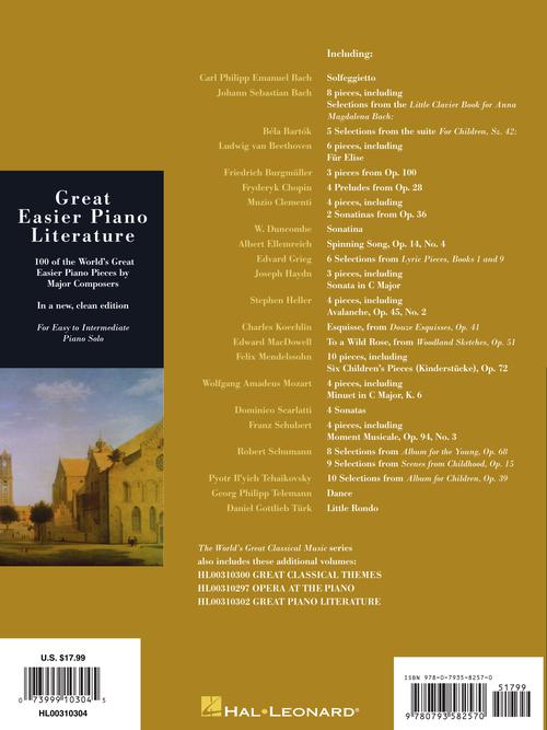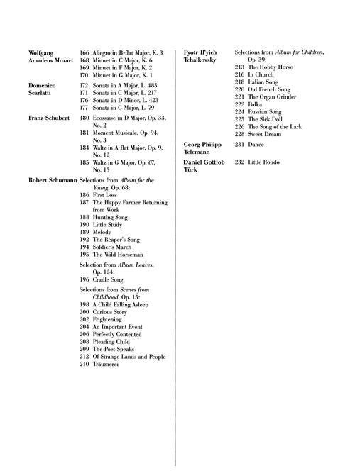 100 favorite piano compositions by 22 composers at the early intermediate to intermediate level. Contents: C.P.E. BACH: Solfeggietto · BACH: Little Prelude No. 2 in C Major · Little Prelude No. 3 in C Minor · Little Prelude No. 7 in E minor · Little Prelude No. 8 in F Major · Musette in G Major (English Suite No. 3) · March in D Major · Minuet in G Major · Musette in D Major · BARTOK: Suite for Chidren, Sz. 42: Alone in the Rain · Circle Dance · The Flowers Sing of Love · Forward March · Round Dance · BEETHOVEN: Ecossaise, WoO 86 · Ecossaise, WoO 23, Fur Elise · Minuet in G Major · Sonata, Op. 49, No. 1 · Sonata, Op. 49, No. 2 · BURGMULLER: Arabesque, Op. 100, No. 2 · Inquietude, Op. 100, No. 18 · Pastorale, Op. 100, No. 3 · CHOPIN: Prelude, Op. 28, No. 7 · Prelude, Op. 28, No. 6 · Prelude, Op. 28, No. 20 · Prelude, Op. 28, No. 4 · CLEMENTI: Sonatina, Op. 36, No. 1 · Sonatina, Op. 36, No. 3 · Arietta in C Major, Op. 42 · Spanish Dance, Op. 42 · DUNCOMBE: Sonatina · ELLMENREICH: Spinning Song, Op. 14, No. 4 · GRIEG: Album Leaf, Op. 12, Elves' Dance, Op. 12 · Waltz, Op. 12 · Cradle Son, Op. 68 · Grandmother's Minuet, Op. 68 · Sailor's Song, Op. 68 · HAYDN: Allegro in F Major · Dance in G Major · Sonata in C Major · HELLER: Avalanche, Op. 45, No. 2 · Prelude, Op. 119, No. 25 · Etude, Op. 47, No. 19 · The Tolling Bell, Op. 125, No. 8 · KOECHLIN: Esquisse, Op. 41 · MACDOWELL: To a Wild Rose, Op. 51 · MENDELSSOHN: Six Children's Pieces, Op. 72 · Confidence, Op. 19 · Venetian Boat Song No. 1, Op. 19 · Fath, Op. 102 · Tarantella, Op. 102