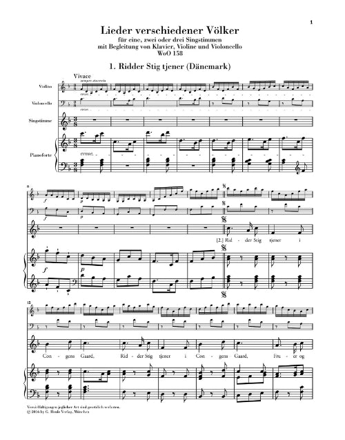Complete Edition with critical report. German text. Contents: Ridder Stig tjener (Dänemark) Horch auf, mein Liebchen (Deutschland) Wegen meiner bleib d'Fräula (Deutschland) Wann i in der Früh aufsteh (Tirol) I bin a Tyroler Bue (Tirol) A Madel, ja a Madel (Tirol) Vier solche Buema afipackt (Tirol) Ih mag di nit nehma (Tirol) Oj, oj upilem sie w karczmie (Polen) Poszla baba po popiól (Polen) Yo no quiero embarcarme (Spanien) Seus lindos olhos (Portugal, Duett) Vo lesocke komarockov mnogo urodilos(Russland) Ach recenki, recenki (Russland) Kak poli nai podruki (Russland) Schöne Minka (Ukraine) Wiegenlied (Schweden) An ä Bergli bin i gesässe (Schweizer Lied, Duett) Una paloma blanca, Bolero a solo (Spanien) Como la mariposa, Bolero a due (Spanien) La tirana se embarca (Spanien) Édes, kínos emlékezet (Ungarn) Da brava, Catina (Venedig) Non, non, Colette nest point trompeuse (Frankreich) Air français O Sanctissima, Terzetto (Sizilien) La Biondina in gondoleta (Venedig) Das liebe Kätzchen (Österreich) Der Knabe auf dem Berge (Österreich)