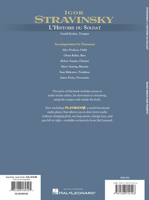 Stravinsky wrote this septet in 1917. As always, he led the composing world with innovation and excitement and the work is still widely performed in our time. Includes a printed music score and digital access to recordings including a complete performance with soloist; then a second version with the accompaniment, minus you, the soloist. Performed by Gerald Kocher, trumpet Accompaniment: Parnassus: Alice Poulson, violin; Glenn Rubin, bass; Robert Yamins, clarinet; Harry Searing, bassoon; Sean Mahoney, trombone; James Preiss, percussion The price of this book includes a unique code that provides access to audio tracks online, for download or streaming. The tracks include PLAYBACK+, a multi-functional audio player that allows you to slow down audio without changing pitch, set loop points, change keys, and pan left or right - available exclusively from Hal Leonard.