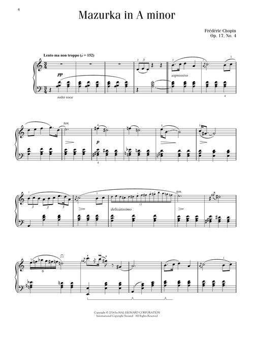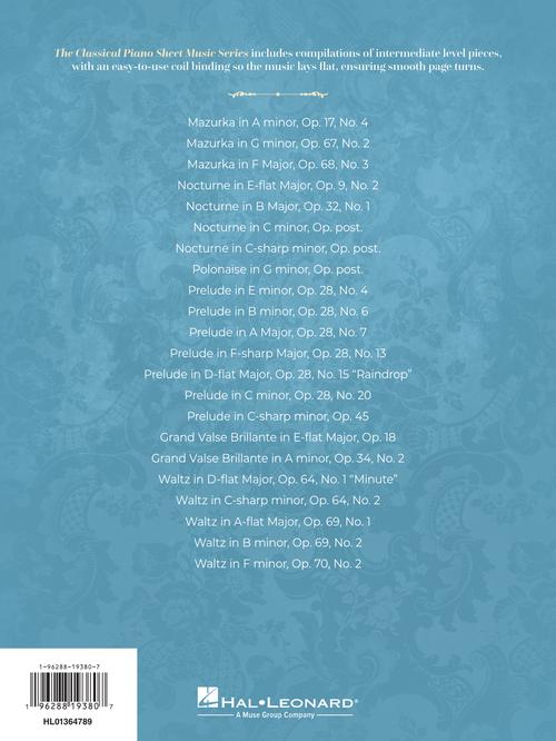 The Classical Piano Sheet Music Series includes compilations of intermediate-level pieces, with an easy-to-use coil binding so the music lays flat, ensuring smooth page turns. This edition features 22 favorites: Mazurka, Op. 17, No. 4 · Mazurka, Op. 68, No. 3 · Mazurka, Op. 67, No. 2 · Nocturne in C Minor, KK. IVB, No. 8 · Nocturne in C-Sharp Minor, KK. Anh. Ia, No. 6 · Nocturne in E-Flat Major, Op. 9, No. 2 · Nocturne, Op. 32, No. 1 · Polonaise in G Minor, KK IIa, No. 1 · Prelude in a Major, Op. 28, No. 7 · Prelude in B Minor, Op. 28, No. 6 · Prelude in C Minor, Op. 28, No. 20 · Prelude in C-Sharp Minor, Op. 45 · Prelude in D-Flat Major, Op. 28, No. 15 Raindrop · Prelude in E Minor, Op. 28, No. 4 · Prelude in F-Sharp Major, Op. 28, No. 13 · Valse Brillante in a Minor, Op. 34, No. 2 · Waltz in A-Flat Major, Op. 69, No. 1 · Waltz in B Minor, Op. 69, No. 2 · Waltz in D-Flat Major (Minute Waltz), Op. 64, No. 1 · Waltz, Op. 18 · Waltz, Op. 70, No. 2 · Waltz, Op. 64, No. 2.