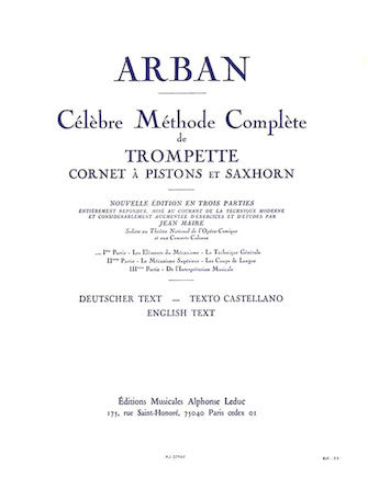 Célèbre Méthode Complète de Trumpet, Valved Cornet and Saxhorn has assisted many generations of Trumpet and Cornet players. The compilation by French cornetist, conductor and composer, Jean-Baptiste Arban (1825-1889) successfully addresses requirements of modern technique and contemporary musical writing. Arban studied at the Paris Conservatoire and led a prosperous career as a versatile and accomplished musician. Célèbre Méthode Complète for Trumpet, Valved Cornet and Saxhorn is divided into three parts, which incorporate a vast variety of musical elements. Part 1 includes performance directions, holding the instrument, tuning slides, sound, long notes, staccato, transposition, syncopation, martellato, legato, arpeggios, mutes, extended techniques and vibrato. Containing a large amount of instruction in French, English, German and Spanish, Arban's Célèbre Méthode Complète de Trumpet, Valved Cornet and Saxhorn is not to be missed by any aspiring brass player.