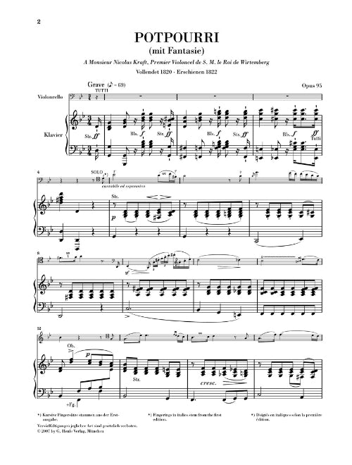 Johann Nepomuk Hummel Potpourri Op 95 Fantasy For Cello And Orchestra Piano