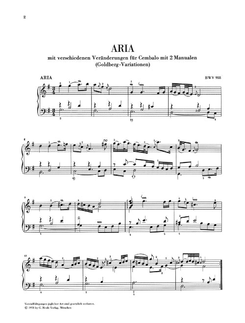The Goldberg Variations are without a doubt the most important piano cycle of the 18th century. Only Beethoven's Diabelli Variations from the 19th century can be compared to them as far their far-reaching significance is concerned. Bach's own manuscript might not have survived, but the corrected first printing of the Aria mit verschiedenen Veraenderungen vors Clavicimbal mit 2 Manualen (thus the title) has done so. This first edition serves as the primary source for our edition; furthermore the musical text was compared to other sources as, for example, with Bach's own record of the Aria (not yet referred to as such) in the little notebook for Anna Magdalena .