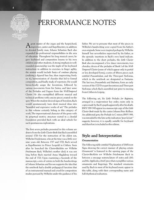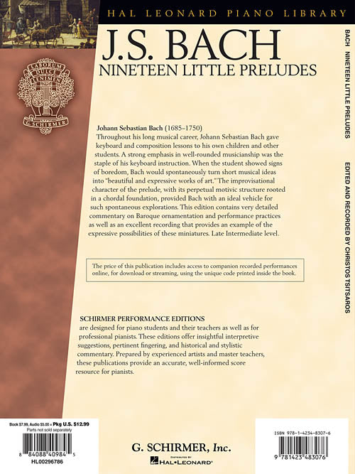 Bach's intermediate level little preludes are gems to be played for pure enjoyment, for any recital, or as steps toward the more challenging Well-Tempered Clavier. Contains extensive discussion and examples on Baroque ornamentation. Contents: Prelude in C Major, BWV 924 · Prelude in D minor, BWV 926 · Prelude in F Major, BWV 927 · Prelude in G minor, BWV 930 · Prelude in F Major, BWV 928 · Prelude in D Major, BWV 925 · Prelude in A minor, BWV 931 · Prelude in C Major, BWV 933 · Prelude in C minor, BWV 934 · Prelude in D minor, BWV 935 · Prelude in D Major, BWV 936 · Prelude in E Major, BWV 937 · Prelude in E minor, BWV 938 · Prelude in C Major, BWV 939 · Prelude in C minor, BWV 999 · Prelude in D minor, BWV 940 · Prelude in E minor, BWV 941 · Prelude in A minor, BWV 942 · Prelude in C Major, BWV 943
