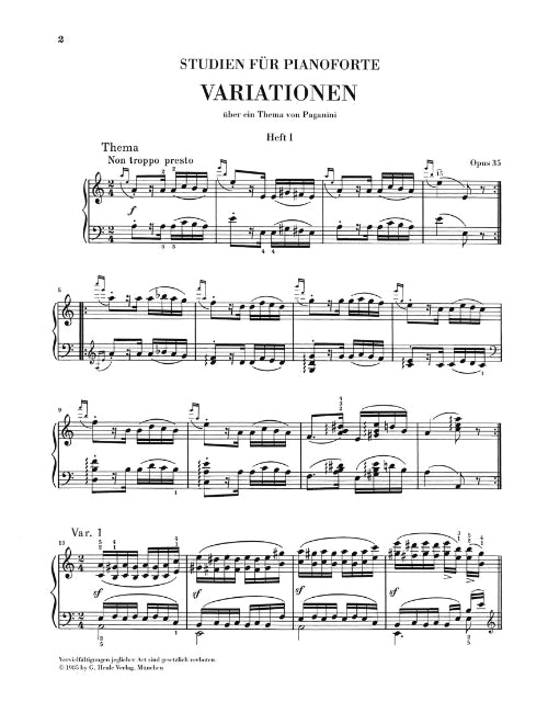 In the 19th century, Nicoló Paganini was the embodiment of the virtuoso. Many composers used his musical themes for their own creative work. Johannes Brahms likewise did not hesitate to use work by Paganini the violin virtuoso as the basis for a composition for his own instrument, the piano, using the Capriccio no. 24 in A minor from Paganini's op. 1 as his model. Brahms initially viewed the Variations, composed in 1862/63, merely as a finger exercise for himself, and had no intention of publishing them. After several years he fortunately decided otherwise, and thus with this Urtext edition pianists who are Brahms afficionados can enjoy an unusual virtuoso masterpiece. In contrast to the variations on the same theme by Chopin, Schumann and Liszt, those by Brahms offer a much richer, more novel spectrum of pianistic variations. Whether players find them to be witches' variations, as did Clara Schumann, is a matter for them.