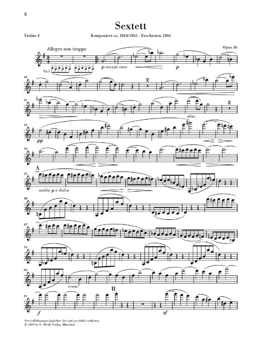 Brahms's First String Sextet became very popular after its publication in 1861, yet his publisher Simrock still hesitated when the composer offered him a second such work in 1865, in the same cheerful mood. So Brahms made overtures to other publishers, and then Simrock finally agreed to take it on. The critics were initially rather skeptical towards this Sextet op. 36, but Brahms's friends thoroughly approved of it. Clara Schumann praised its accomplished motivic work, while others enthused about its magical sound colors. This practical edition by Katrin Eich, based on the Brahms Complete Edition, now offers performers the opportunity to form their own opinion, whether in performance or by perusing our study edition. The parts include player-friendly cue notes and have excellent page-turns.