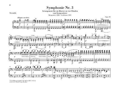 In order to also promote the circulation of his works outside the concert hall, Johannes Brahms made piano arrangements of many of his orchestral works. As the composer, he was able to take greater liberties than any other arranger would have been able to take. And it is precisely due to Brahms' creative ideas in the piano scoring that his arrangements have enjoyed renewed interest in the music world over the past decades. With this Urtext edition of the Symphonies Nos. 3 and 4, based on the musical text in the Johannes Brahms Complete Edition, Henle's catalogue now contains all four symphonies in the authentic piano arrangements made by the composer. Once again, Andreas Groethuysen has provided the fingerings.