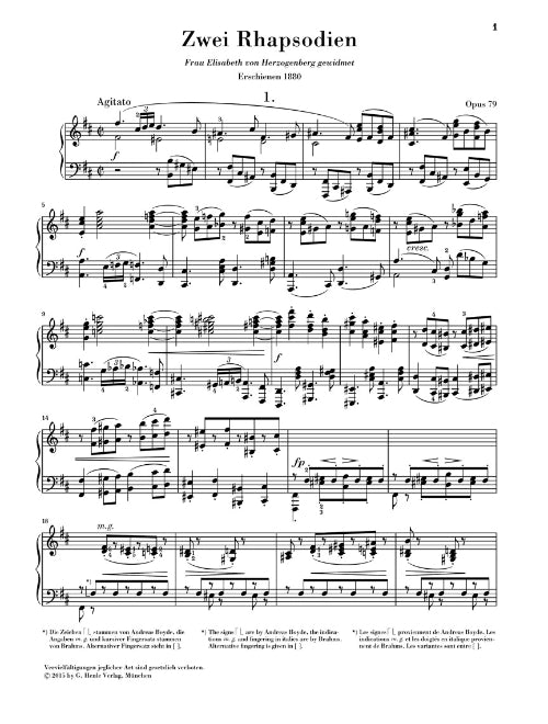Fingering by Andreas Boyde In 1879, about ten years before Johannes Brahms composed his late, melancholic piano pieces, he wrote the two Rhapsodies op. 79 - two markedly passionate and comparatively extensive works. In a letter to the convalescent Clara Schumann, Brahms spoke in a typically understated fashion about the two pieces with which you can really run riot and test whether the course of treatment has actually had any effect. We prefer to agree with Brahms' friend Elisabeth von Herzogenberg: the fact that the G minor is my favourite does not make me insensitive towards the intensely prickly beauty of the one in B minor. Both of these popular works have now been revised on the basis of the new Brahms Complete Edition.