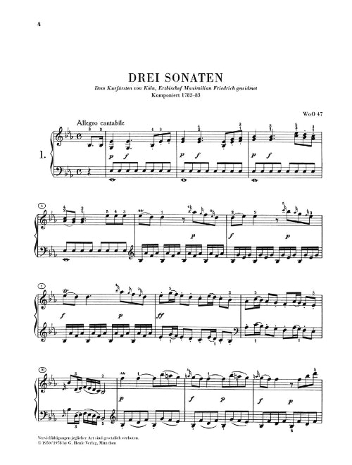 Called Kurfürstensonaten (Prince-Elector sonatas), these three sonatas were published in fall 1783. In the dedication - which was most certainly not formulated by Beethoven - one reads: Most lofty sir ... I have now reached my eleventh year (whereby the composer has been made two years younger), and since then my Muse has whispered to me often during the hours of devotion: Be bold and lay down the harmonies of your soul! ... May I now, exalted Prince, dare to lay the first of my juvenile outpourings at the steps of your throne? In fact, the three sonatas have a special place among Beethoven's earliest compositions, already exude his spirit, and can be used to acquaint the budding pianist with this composer.