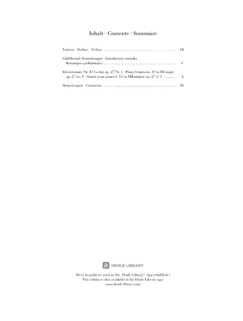 Beethoven gave this sonata the unusual title Sonata quasi una Fantasia, which it shares, along with its opus number, with the considerably more famous Moonlight Sonata. Both sonatas - along with the preceding sonata with the funeral march op. 26, and the thre sonatas op. 31 soon to follow - usher in Beethoven's conquest of new musical territory in this genre. With a complex structure that oscillates between fantasia and sonata, op. 27 no. 1 has long presented pianists with great interpretive challenges that, once they have been overcome, bring to light a true jewel. G. Henle Publishers now also offers this sonata in a new edition, with proven fingering and interpretive suggestions by Murray Perahia and edited by the team of Beethoven experts Gertsch and Perahia.