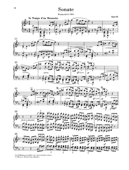 This work, in two movements and dating from 1804, is clearly among the lesser-known of Beethoven's 32 piano sonatas. The lack of a sonata-movement form, the old-fashioned heading in Tempo d'un Menuetto of the opening movement, and the motor rhythm of the following finale perplexed Beethoven's friends and students. While even in the 19th century people were convinced that external circumstances had caused Beethoven to publish a torso, today we belive that the composer was following a particular formal concept that consciously heightened the contrast between the two sections so powerfully that composition of a further movement was unnecessary for the balance of the sonata.
