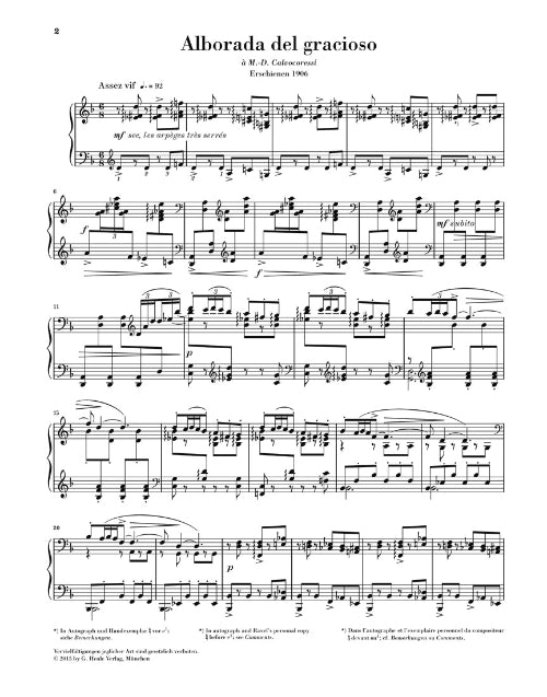 In his Autobiographical Sketch Ravel looks back and stresses the importance of his Miroirs (51480842), published in 1906, for his harmonic evolution. He said that they had disconcerted even those musicians who had been most familiar with my compositional style up to then. This is particularly true of the fourth piece in the collection, Alborada del gracioso (Morning song of the court jester), with its frequent employment of harsh dissonances. This both technically and musically charming genre scene, full of rousing ideas and rhythms, is one of the French composer's best-known piano pieces today. Henle now issues it in a single Urtext edition.