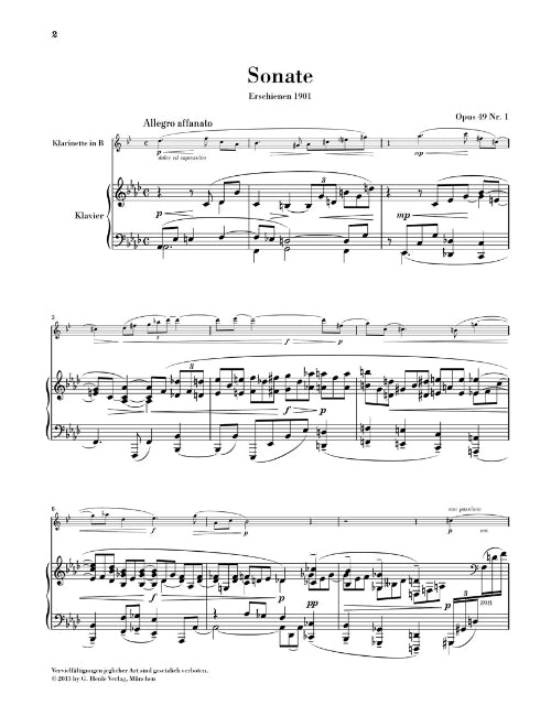 Eight years after he had composed his first two Clarinet Sonatas op. 49, Reger confessed in a letter to a friend that he was once again committing a new crime against harmony and counterpoint. He was referring to the Sonata for Clarinet and Pianoforte op. 107. Reger made a point of not destroying the chamber music character of the work by having too much virtuosic padding - Brahms developed classic examples of what the style was meant to be like. Alongside the sonatas, the Urtext edition also contains two charming encores: a Tarantella in g minor and an Album Lead in E flat major. The Sonata op. 49.2 is for clarinet in A. The other pieces are for clarinet in B flat.
