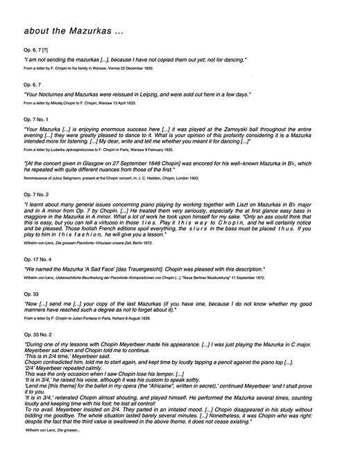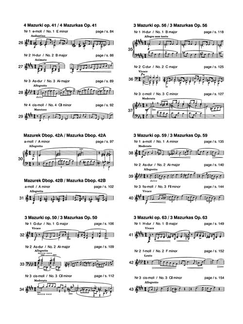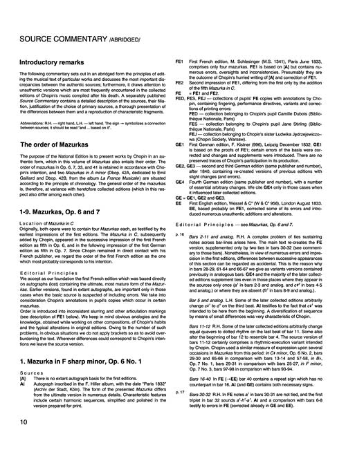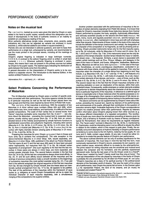Mazurkas Chopin National Edition 4A, Vol. IV Softcover Includes Mazurkas Op. 6-41, Op. 42A and 42B, Chopin composed his Mazurkas continuously from 1825 to 1849. Inspired by Polish folk dance, Chopin's mazurkas gradually became compositions of meditative lyricism, and the most personal statement of expression. Of the variants in musical notation, those designated ossia were marked in this way by Chopin himself or inscribed in his hand in pupils' copies. See also 00132282 for the Mazurkas published posthumously.arked in this way by Chopin himself or inscribed in his hand in pupils' copies, while those without this indication result from textual divergences in authentic copies or from difficulties in reading the text in an unambiguous way. The National Edition of the Works of Fryderyk Chopin Published by PWM Exclusively Distributed by Hal Leonard Corporation Co-Editors Jan Ekier and Pawel Kaminski The objective of the National Edition is to present Chopin's complete output in its authentic form, based on the entire body of available sources. Sources were analyzed with up-to-date scientific and musicological methodology. The National Edition was based on sources originated from the composer, mainly autographs, copies of autographs and first editions with the composer's corrections, and pupils' copies with Chopin's annotations. In cases when original sources were lacking, the closest possible materials were used. Collecting the source materials was a laborious task which took years of effort. The characteristics of sources, the links and discrepancies between them as well as the reasons for particular editorial decisions are discussed in the Source Commentary in each volume. The Performance Commentary appended to each volume includes: the realization of ornaments, comments on pedal markings (the original markings sometimes are inadequate, due to the difference in sound between pianos used in Chopin`s times and modern pianos), suggestions as to the harmonic legato (a performance technique often used by Chopin and now forgotten). About the National Edition (http://serwer1374796.home.pl/wp-content/uploads/2013/05/o_wydaniu_narodowym.pdftarget=_blank) Full Introduction to the Polish National Edition of the Works of Fryderyk Chopin (http://serwer1374796.home.pl/wp-content/uploads/2013/05/introduction_to_NE.pdftarget=_blank) Inventory # : 00132281 UPC: 884088971151 ISBN: 1480390798 Width: 9.25" Length: 12" Height: 0.43" Product Weight: 1.4 lbs. Number of Pages: 190