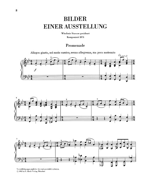 In memory of the deceased illustrator and architect Vikto A. Hartmann (1834-1873), and exhibition of his watercolors and drawings was organized in 1874. Modest Mussorgsky, who had been Hartmann's friend, was inspired by his visit to this exhibition to compose the cycle Pictures at an Exhibition for piano solo; a milestone of piano literature. He wrote it in June 1874 in St. Petersburg and subtitled it Memories of Viktor Hartmann. The picturesque and evocative musical language, which lets the pictures come to life, has remained fascinating to the present day. The source of the Henle Urtext edition is the cleanly witten autograph. The layout of the musical text is based on Mussorgsky's notation.
