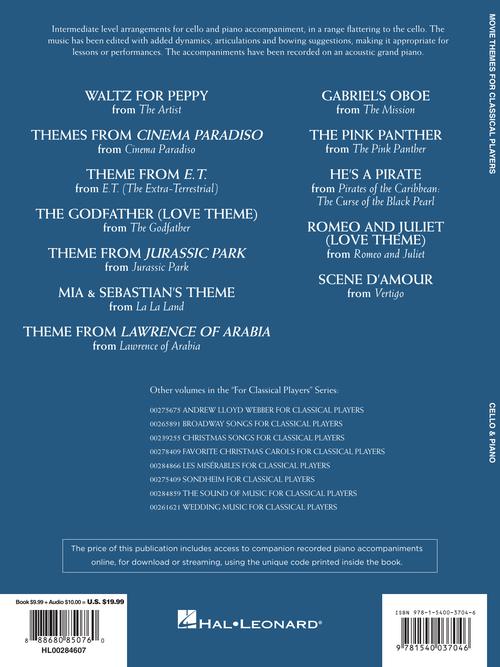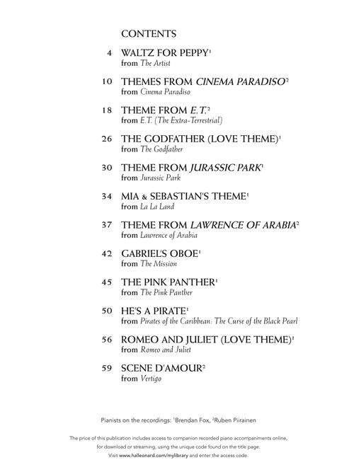Intermediate level arrangements for solo instruments and piano accompaniment, in a range flattering to each instrument. Includes a pull-out instrumental section. The music has been edited with added dynamics, articulations, and phrasing, making it appropriate for lessons or performances. The accompaniments have been recorded on an acoustic grand piano and are available online for download or streaming. Includes: Theme from E.T. (The Extra-Terrestrial) · The Godfather (Main Theme) · He's a Pirate (from Pirates of the Caribbean) · Theme from Jurassic Park · Mia & Sebastian's Theme (from La La Land) · The Pink Panther · and more. Audio is accessed online using the unique code inside the book and can be streamed or downloaded. The audio files include PLAYBACK+, a multi-functional audio player that allows you to slow down audio without changing pitch, set loop points, change keys, and pan left or right.