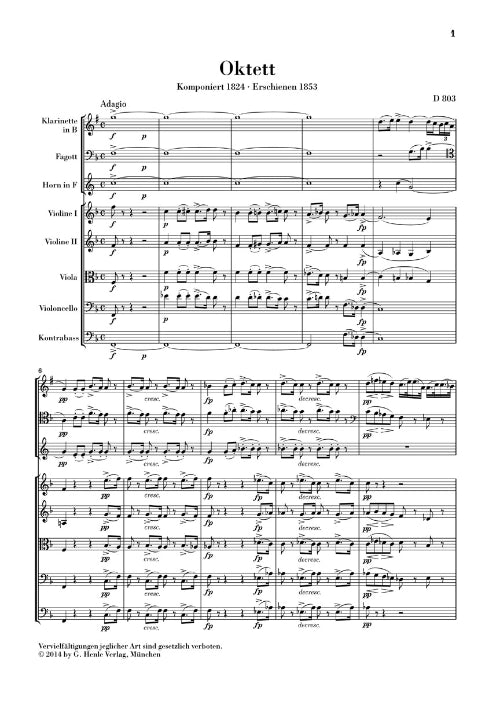 The model for this composition was Beethoven's Septet op. 20, whose Divertimento character and six-part layout were adopted by Schubert, although he merely expanded the instrumentation by adding a second violin. In a letter he numbered his octet amongst the chamber music works with which he desired to blaze a path to the great symphony. It can no longer be ascertained whether the composition was commissioned by Count Ferdinand Troyer, who had a musical salon in Vienna and played the clarinet. We only know that Schubert composed the work at the beginning of 1824, taking only a few weeks to do so and that it was shortly performed at Troyer's afterwards. Today it is one of the most popular larger chamber music works. We are offering our Urtext edition of the Octet (HN 562) as a study score.
