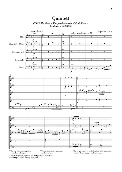 Reicha published a total of 24 wind quintets for the classical scoring of flute, oboe, clarinet, horn, and bassoon; Op. 88, No. 2 is one of the best-loved and most played. If it were possible to surpass Haydn in the composition of quartets and quintets, Reicha would have succeeded with these quintets, thus raved the Allgemeine Musikalische Zeitung on a performance of Reicha's quintets, it seems to me that it is impossible to unite more correctness and clariety with more inventiveness and originality. This work exudes inspiration and spirit from every note. In addition to the parts, we have also produced a handy study edition of the score.