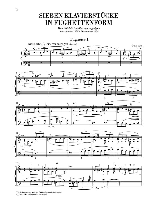 In response to failures, Schumann once again turned more to composing during his time in Düsseldorf. He wrote many new works - also ones for the piano for which he had only written a few pieces after his first years of composing. Bach's music played an important role in the Schumanns' house at the time; this is mirrored in the fact that Schumann turned to baroque forms again. However, he wanted his fugues to be understood as character pieces, just in stricter form. The Piano Pieces in Fughetta Form op. 126, published in the Henle catalog for the first time, unite the strict formal demands with romantic expression in a masterly manner.