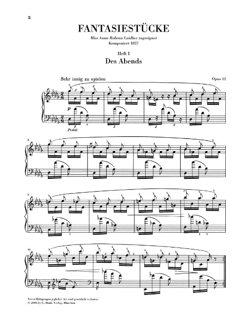 With humor, slow and tender, extremely brisk: the very expression marks of the Op. 12 Fantasy Pieces illuminate their musical universe, a kaleidoscope of ideas and moods. Our revised new edition presents not only the eight original pieces, but also an appendix containing a ninth piece that Schumann excised during the final stages of publication. Several of the composer's friends, including the work's dedicatee Robena Ann Laidlaw, played some of Op. 12 in public before it appeared in print. Later the work achieved rapid and widespread popularity. Perhaps the greatest compliment came from Franz Liszt, who excitedly wrote to the composer, Your 'Fantasy Pieces' have captured my interest in an extraordinary way. I play them truly with delight, and Lord knows there are not many things of which I can say the same.