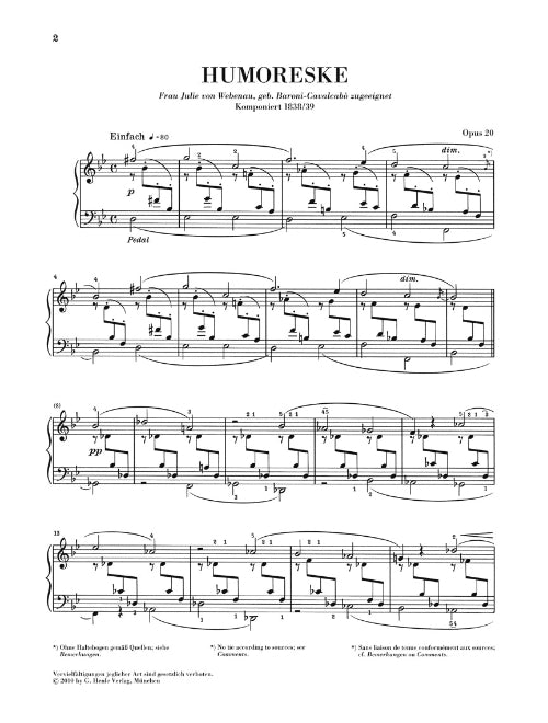Do you not know Jean Paul, our great writer? I have learnt more couterpoint from him that from my music teacher. His Vorschule der Ästhetik with its extensive treatment of humour probably occasioned to Schumann to think of giving a piano work the title Humoreske - thus giving birth to a new musical genre. The romantic humour is not, however, aimed at humour in a modern sense of the word, but rather at a portrayal of the fragility and contradictory nature of the human condition. As if in a kaleidoscope, Schumann juxtaposes the most diverse elements of form and moods. Ernst Herttrich's revision reflects the latest scholarly findings for this unusual work.